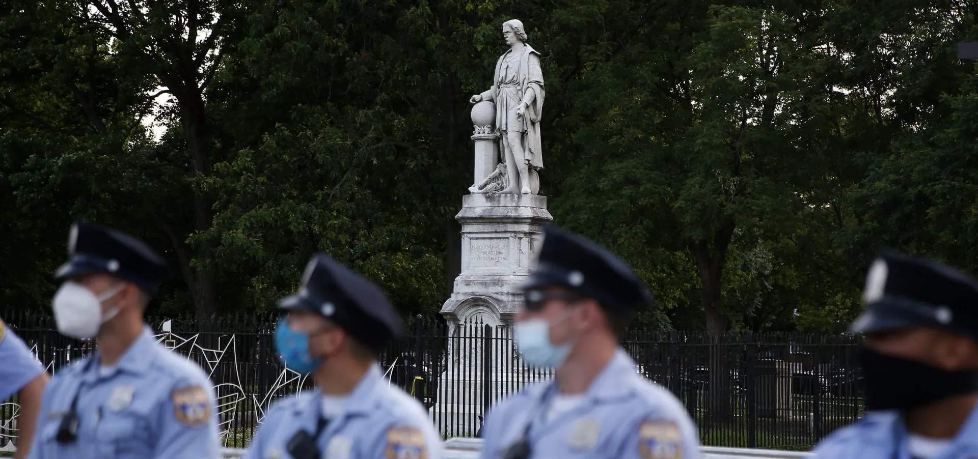 15 June 2020: Philadelphia police guard the Columbus Statue in Marconi Plaza (Photo: Matt Slocum/AP)
