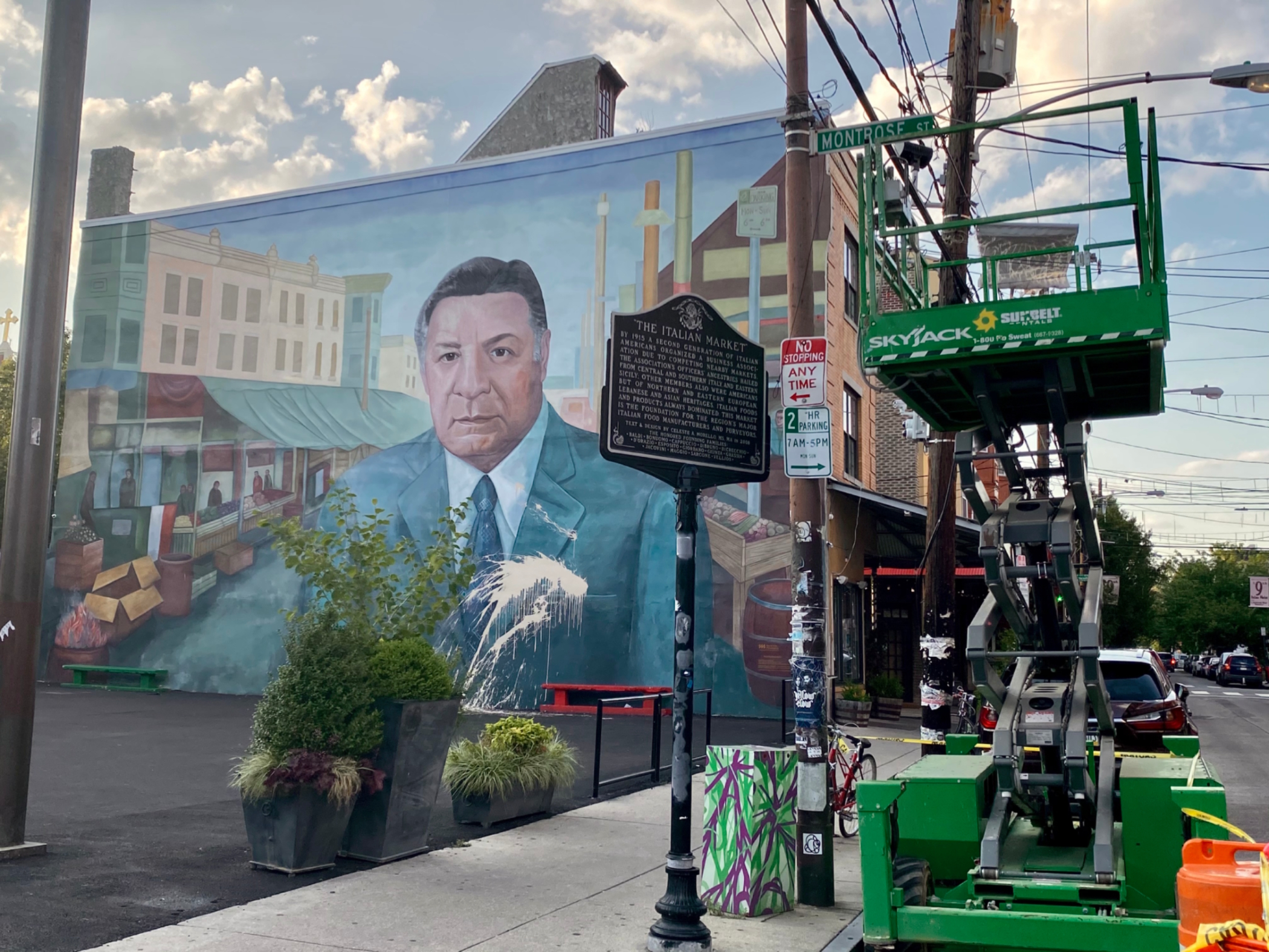 The cherry picker unleashed on June 3, 2020 —hastily concealing the controversial mural. On the same day, the Rizzo Statue was removed from Center City).