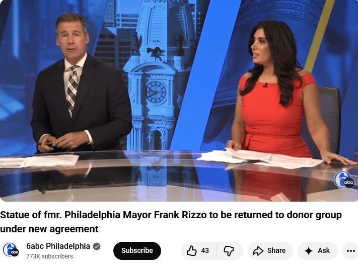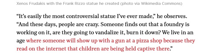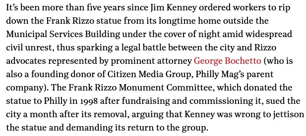 Attorney Bochetto might seem to be veering into a "Woke Mob" conspiracy theory but he is not entirely wrong about the "artistic community", as explicated by the author of the Rizzo statue himself. (Frudakis describes himself as politically "to the left of Bernie Sanders").
