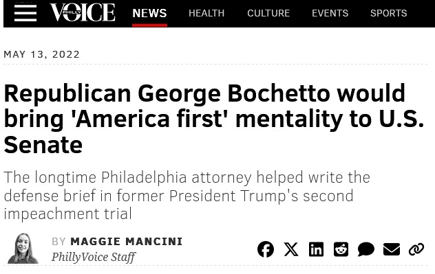 George Bocchetto launched an expensive self-funded Senate race. (PhillyVoice, May13, 2022) Ultimately, he came in seventh in the Republican Primary, with 1.1% of that party's vote. In 1998, he made a hastily truncated run for mayor.