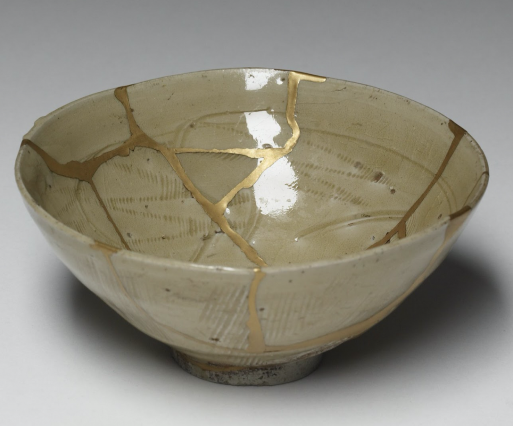 A tenth-century Chinese stoneware bowl with Japanese kintsugi (golden joinery) repairs. (Baltimore, Walters Art Museum)